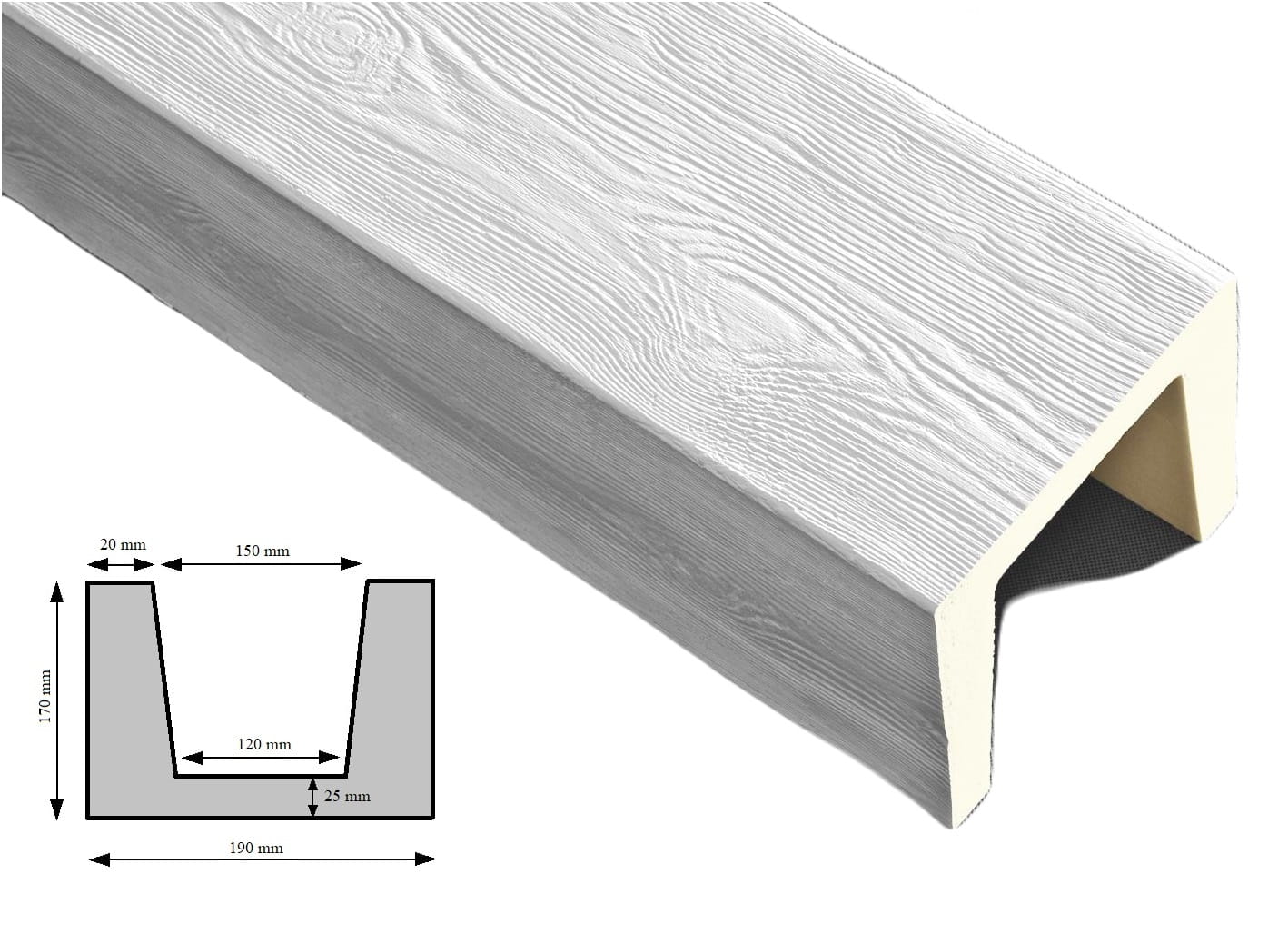 - Dostępne kolory belki ozdobnej: Rustik Jasny, Rustik Ciemny, Biały, Patyna (Brąz, Beż, Oliwka)